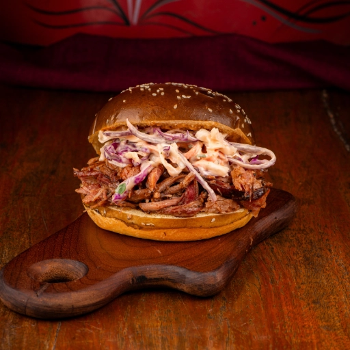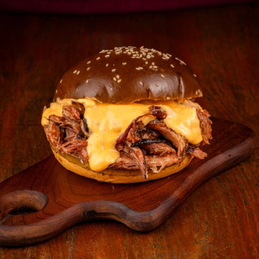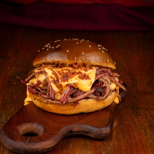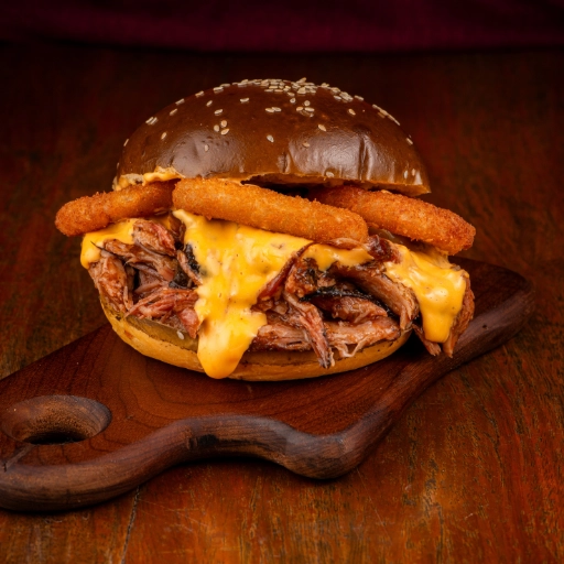 Pão brioche, carne de porco defumada e desfiada, creme de queijo cheddar e cebola empanada