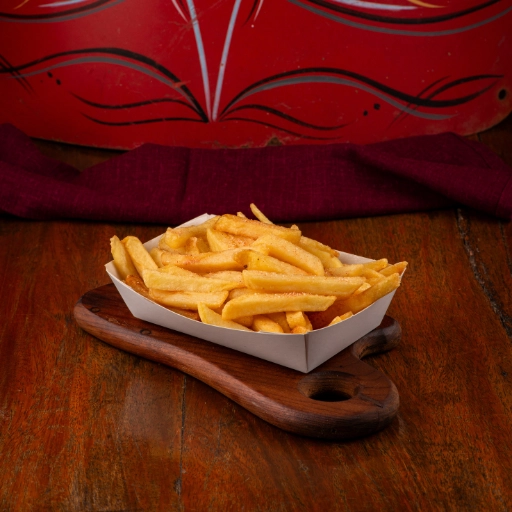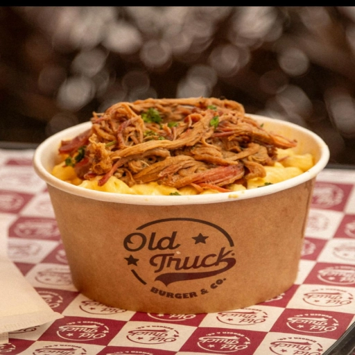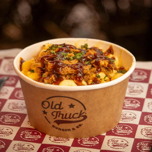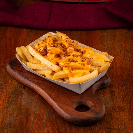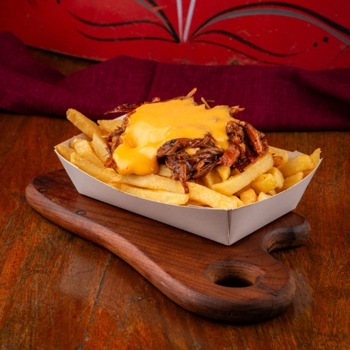 Batata frita com carne de porco defumada e desfiada e creme de queijo cheddar