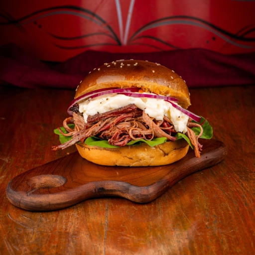 Pão brioche, Brisket bovino defumado e desfiado, sour cream, rúcula e cebola roxa
