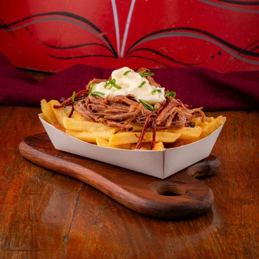 Batata frita com brisket( peito bovino) defumado e desfiado e sour cream