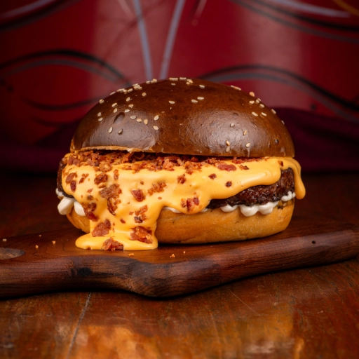 Pão brioche, hambúrguer artesanal defumado de 160g, creme de queijo cheddar e farofa de bacon