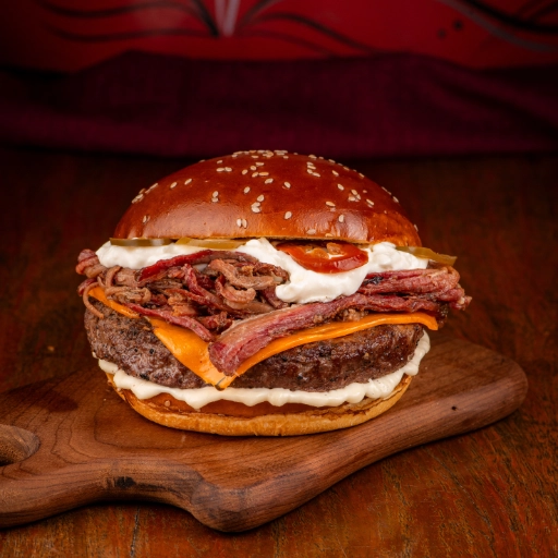 Pão brioche, hambúrguer artesanal defumado de 160g, queijo cheddar, brisket ( peito bovino defumado), sour cream e pic... Ver completo