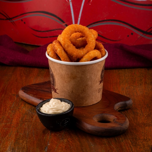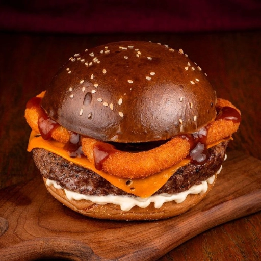 Pão Brioche, hambúrguer artesanal defumado de 160g, queijo cheddar, cebola empanada e molho barbecue
