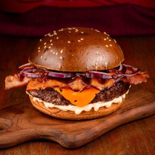 Pão brioche, hambúrguer artesanal defumado de 160g , queijo cheddar, cebola roxa e bacon